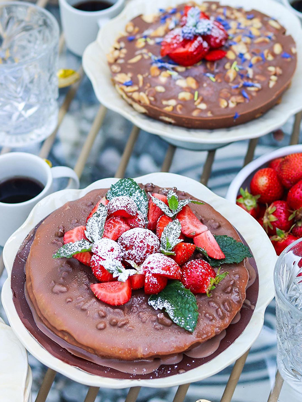 Ta fram Almondy Daim Cake från frysen och lägg upp på ett fint fat. Skölj av jordgubbarna och lägg dom gärna på lite hushållspapper några minuter för att torka. Skiva jordgubbarna o placera ut på mitten av tårtan. Toppa med några kvistar mynta och avsluta med att strö florsocker över. Lätt som en – piece of cake!