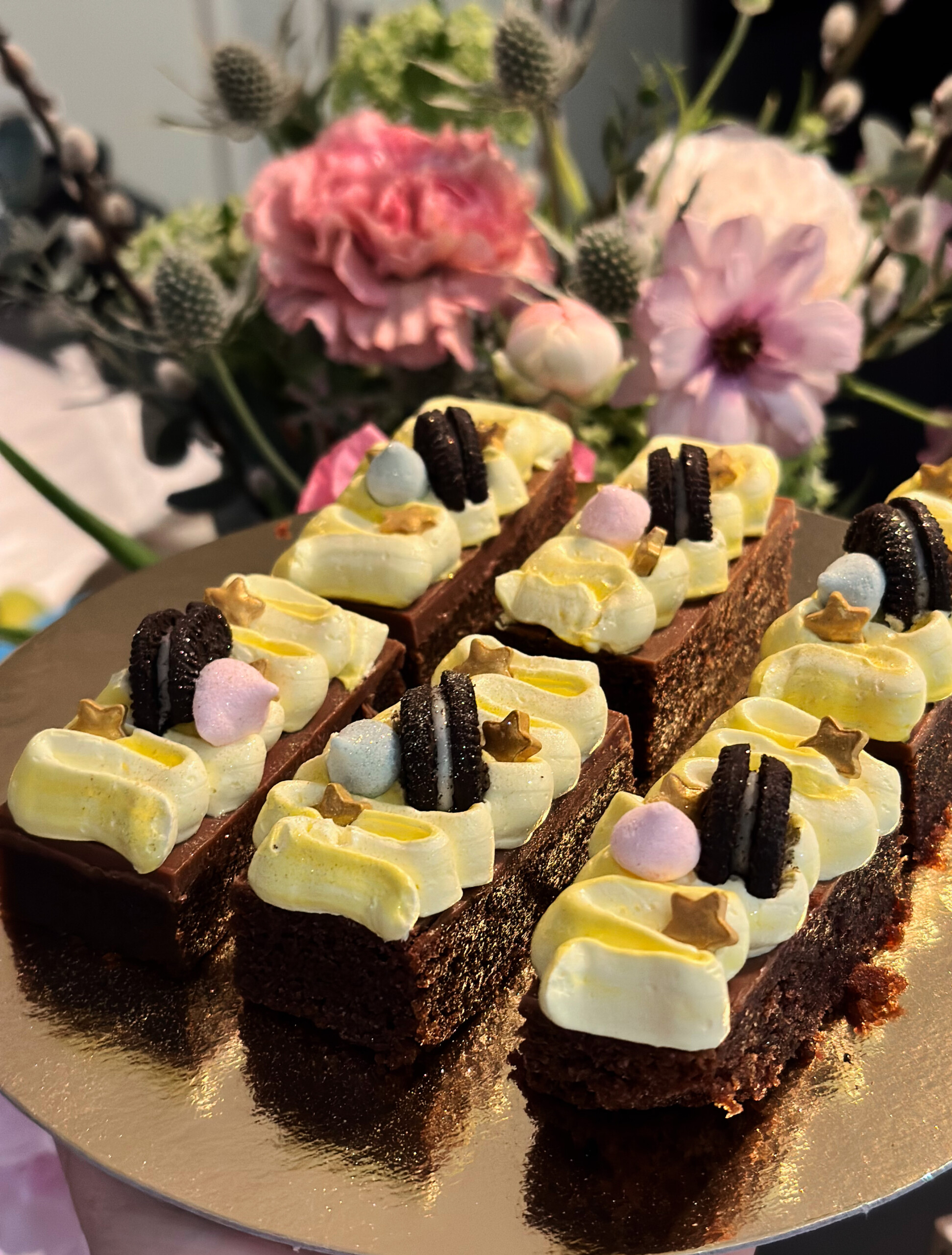Fyll en spritspåse med ett avlångt munstycke med krämen och ringla ut krämen på varje bit. Dela oreo kakorna på mitten och placera en på varje bit så den rundade delen är uppåt. Piffa till med strössel och minimaränger innan du sprayar på ätbart guldglitter.