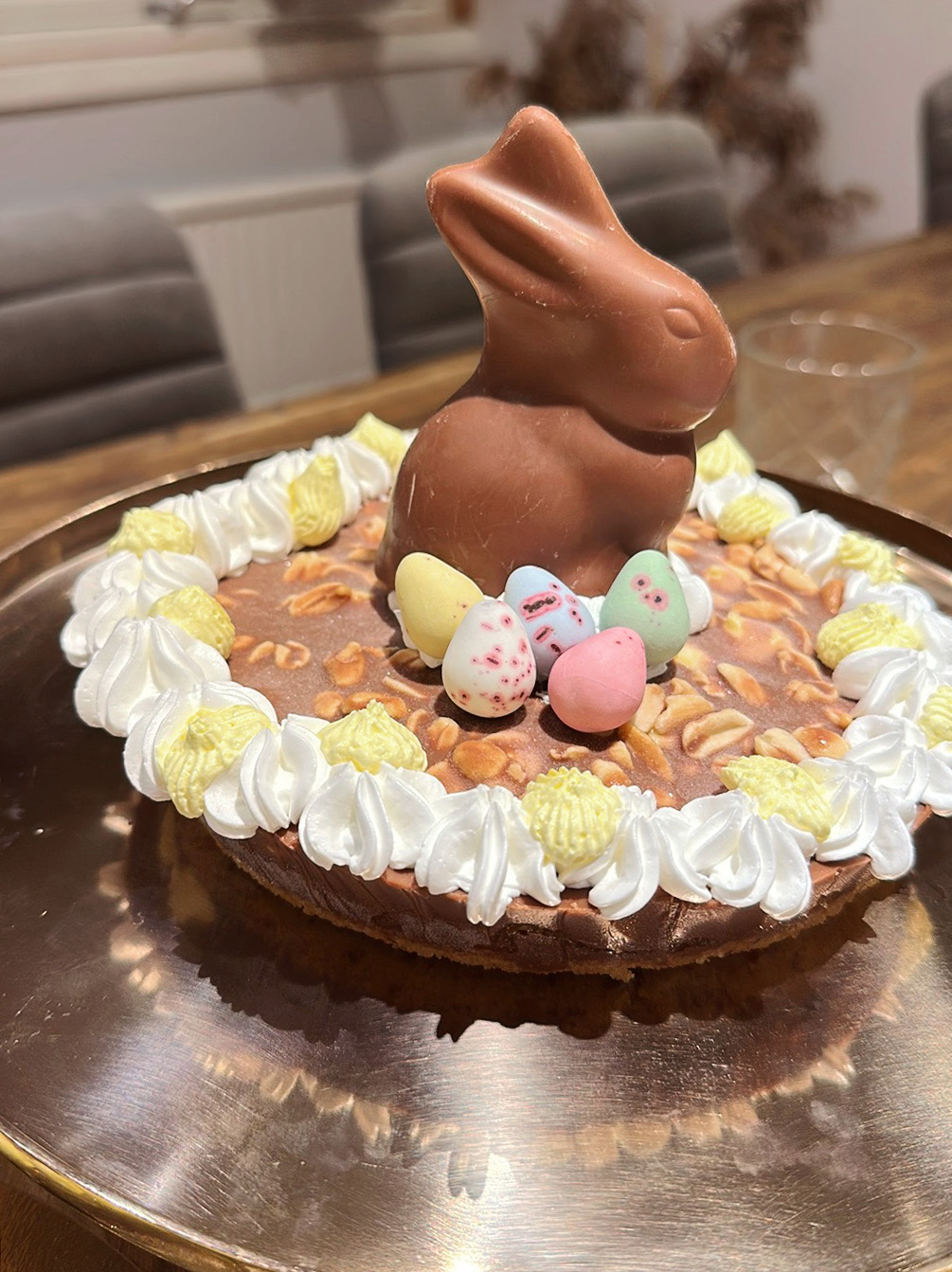 Ta fram tårtan ur frysen och lägg upp den på ett fint tårtfat, gärna på fot. Börja med att spritsa ut den vita krämen runt om på tårtan och en klick i mitten. Toppa med gul kräm runt om på tårtan. Ta av eventuellt papper från chokladkaninen och placera den i mitten av tårtan. Dekorera med några färgglada chokladägg och sen är den sista tårtan klar.