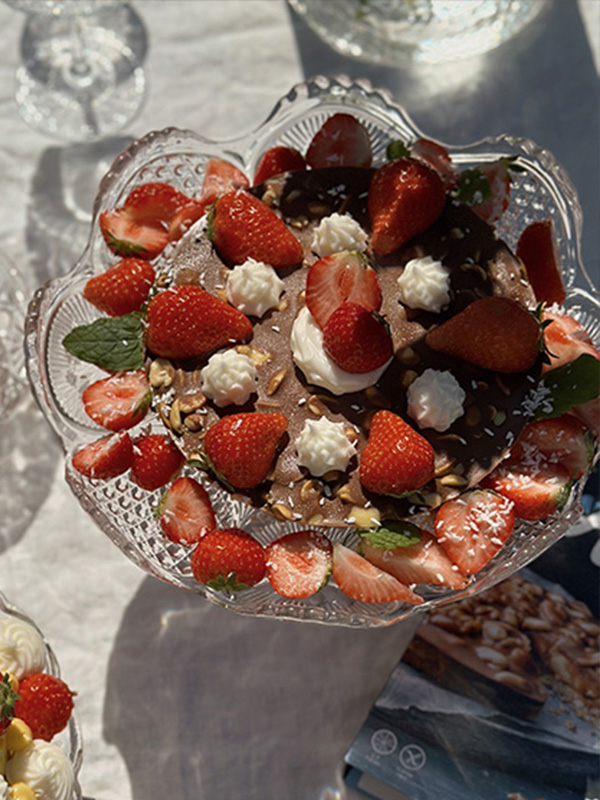 Ta fram din Almondy Salted Caramel tårta från frysen. Skölj av jordgubbarna och dela några av dem på mitten. Lägg upp dem runt om tårtan varvat med hela bär. Spritsa ut toppar runt på toppen av tårtan med en större topp i mitten. Lägg ut delade jordgubbar med platta sidan nedåt. Dekorera med några blad citronmeliss.
