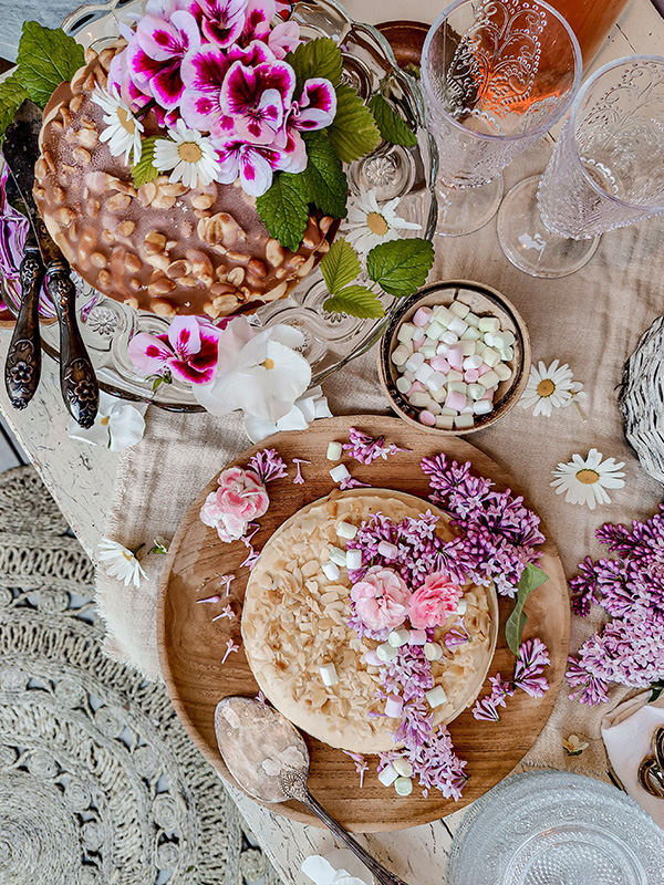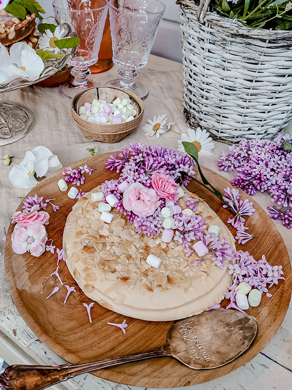 Ta fram din Almondy Almond Cake och lägg upp på ett fint fat. Dekorera tårtan med blommor från Syrén och kanske någon nyponros innan du strör ut marshmallows. Lägg fram en tårtspade och ställ fram tårtan på bordet bredvid den andra.