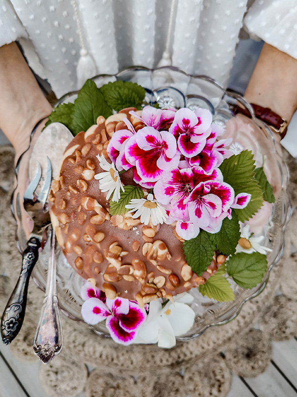 Ta fram din Almondy Saltd Caramel och lägg upp på ett fat, gärna ett med fot om du har. Bryt av några blommor från en pelargon och några prästkragar och dekorera på tårtan och tårtfatet. Lägg fram en tårtspade och ställ fram tårtan på bordet.