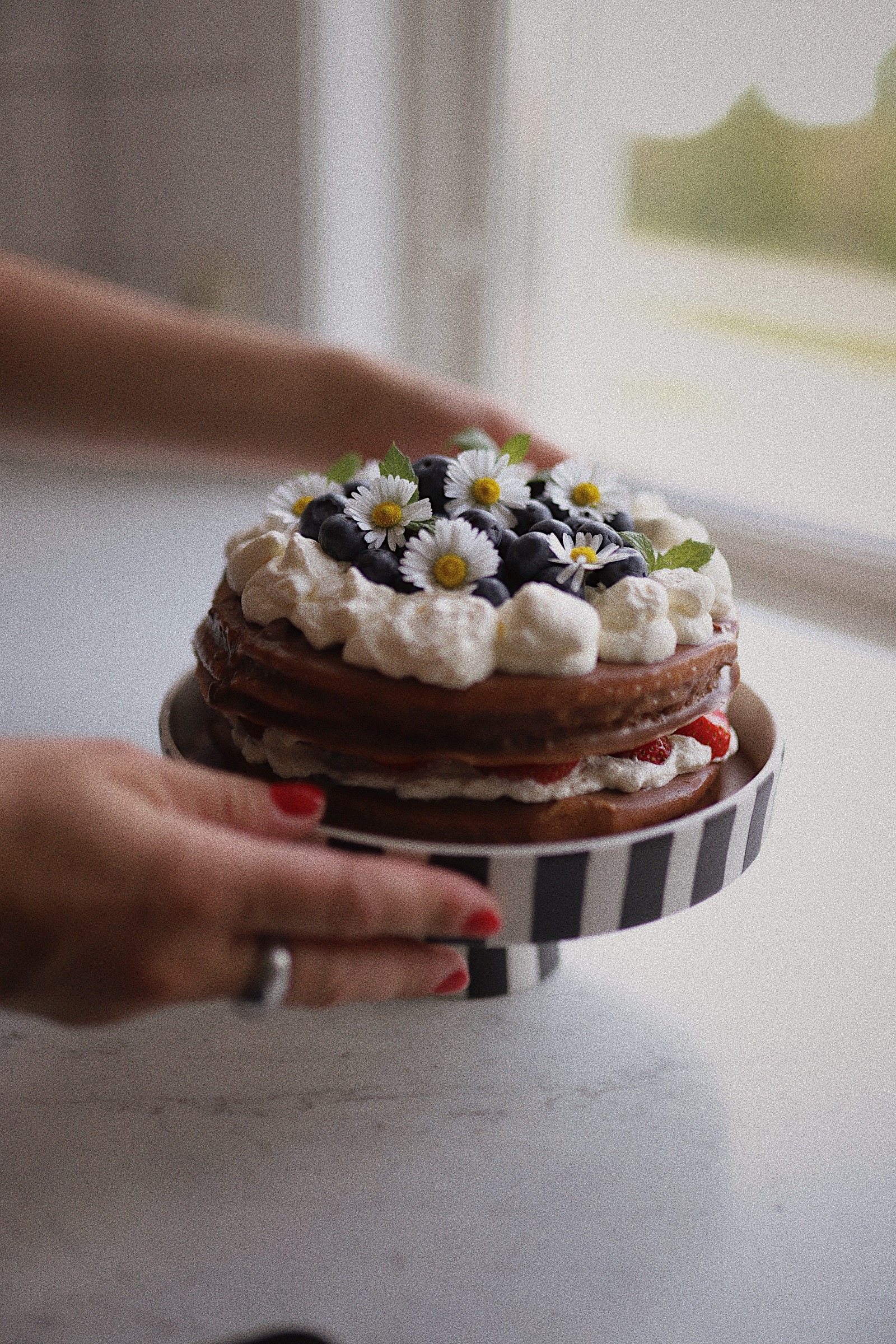 Börja med att skölja av blåbären och jordgubbarna och låt dem rinna av några minuter medan du vispar grädden fluffig och lägger upp en i en spritspåse. Nu är det dags att ta fram ett tårtfat och skiva upp jordgubbarna.