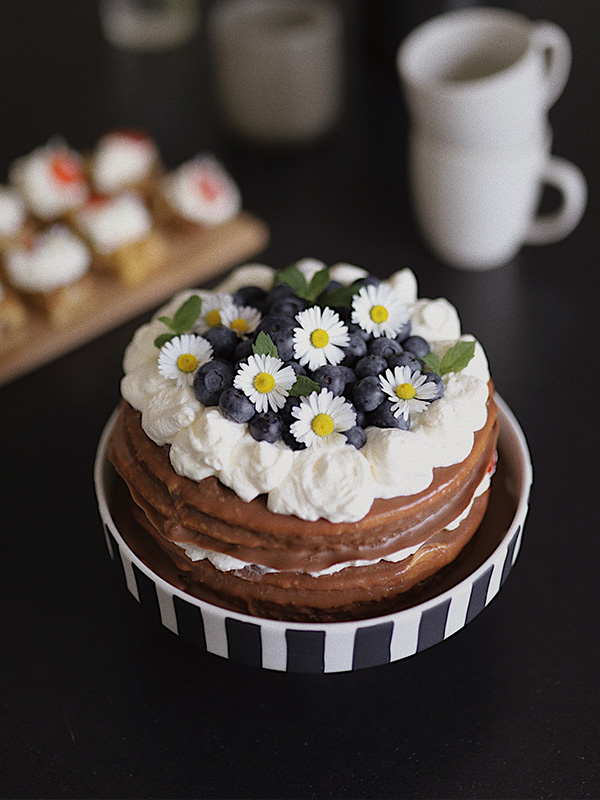 Bara dekorationen kvar sedan är du klar. Spritsa ut grädde längst ut i kanten runt om tårtan så det blir en tom plats i mitten där du kan placerar alla blåbär. Toppa med några söta blommor om du vill ha extra dekoration. Klart!
