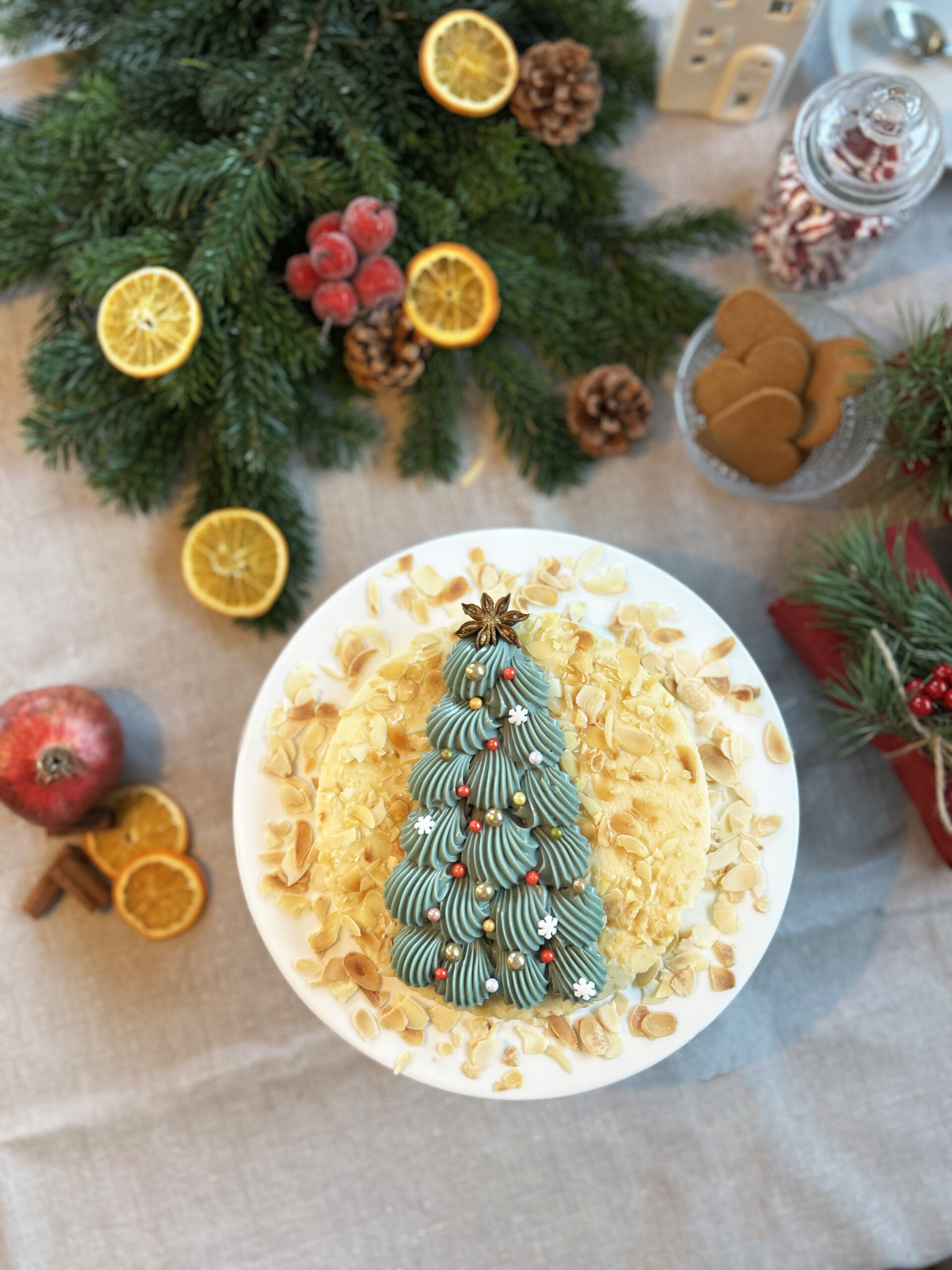 Den här mandeltårtan är perfekt för alla mysiga fikastunder i december. Med karamellfärgad smörkräm, grädde eller frosting kan du enkelt spritsa en vacker julgran som blir fikabordets mittpunkt. Dekorationen gör den både extra god och riktigt stämningsfull.