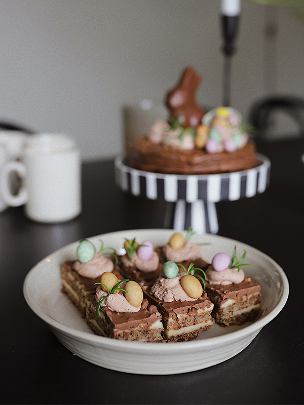 Placera ut de färgglada chokladäggen på varje bit. Toppa med några kvistar av rosmarin.