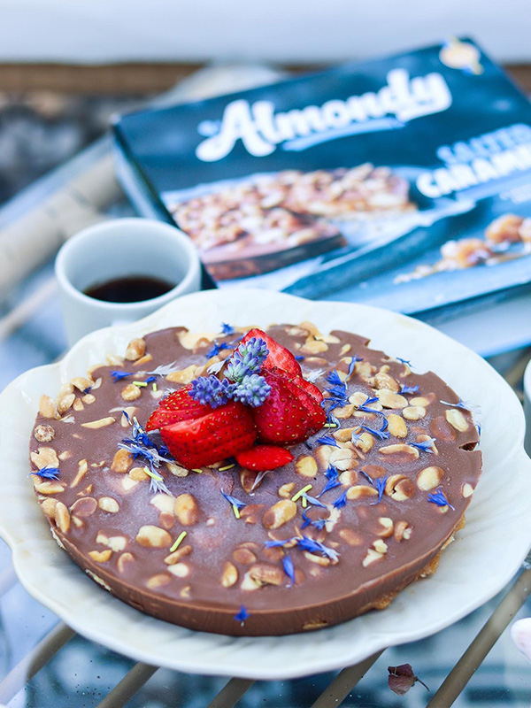 Almondy Salted Caramel är den perfekta mixen av sött och salt. Bakad på mjuk mandelbotten, med ett lager gyllene kräm och saltkola. Toppad med knapriga jordnötter och mjölkchoklad. Smarrigt god att toppa med röda härliga skivade jordgubbar. Får du feeling så är det fint att och pynta med lavendel och strössla över några blad från blåklint.
